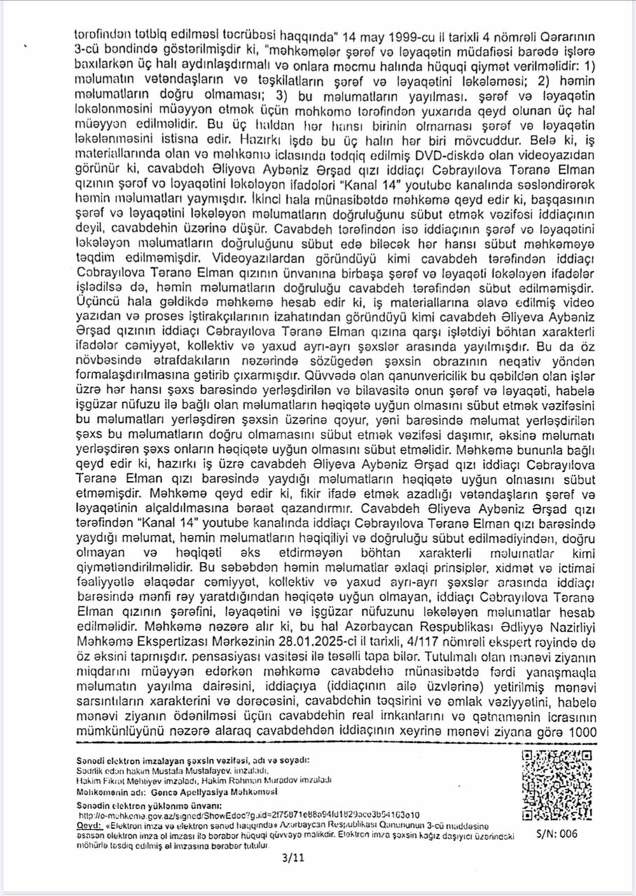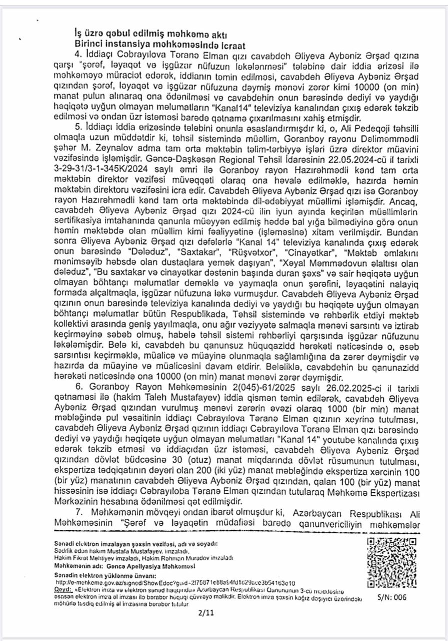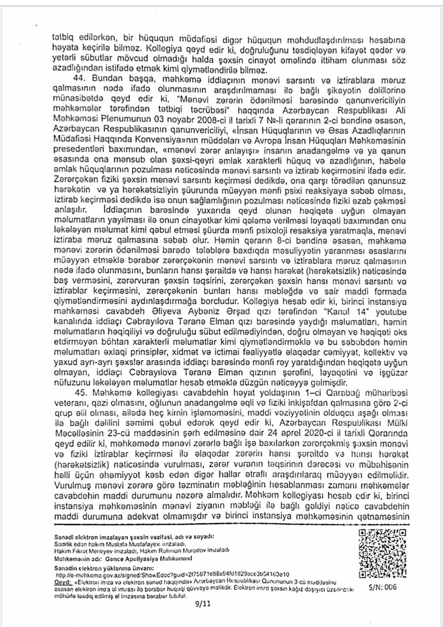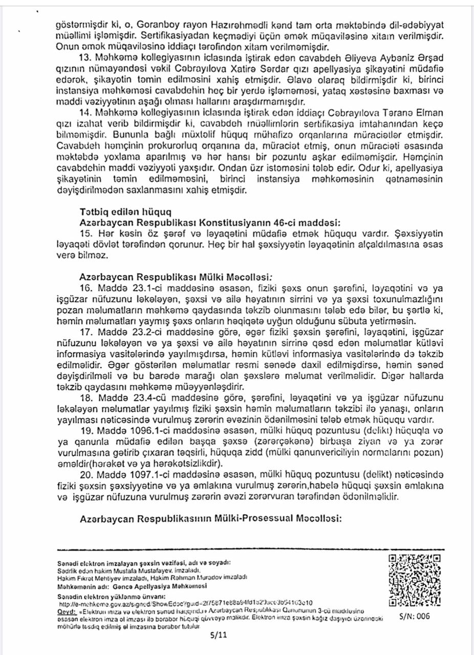 Vəziyyəti daha da gərginləşdirən isə bəzi xəbər saytlarının və Aybəniz Əliyevanı kor-koranə müdafiə edənlərin bu fürsətdən yararlanması oldu. Onlar tanımadıqları, işinə bələd olmadıqları Təranə Cəbrayılova haqqında həmin böhtan xarakterli materiallar əsasında məqalələr tirajlamağa başladılar. Bu mənəvi təzyiqlər qarşısında sarsılmayan Təranə xanım hüquqi dövlətin prinsiplərinə sığınaraq məhkəməyə müraciət etdi. Goranboy Rayon Məhkəməsi irəli sürülən ittihamların tamamilə əsassız olduğu qənaətinə gəldi. Gəncə Apellyasiya Məhkəməsi də bu qərarı qüvvədə saxlayaraq Təranə xanımın həm peşəkar nüfuzunu, həm də mənəvi paklığını bir daha təsdiq etdi. Bu məhkəmə çəkişməsində əsas məsələ tətbiq edilən cərimə deyil, mənəvi ucalığın qorunması və həqiqətin şəri məğlub etməsi idi.