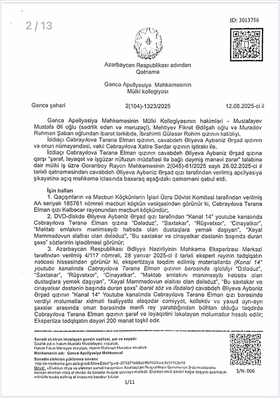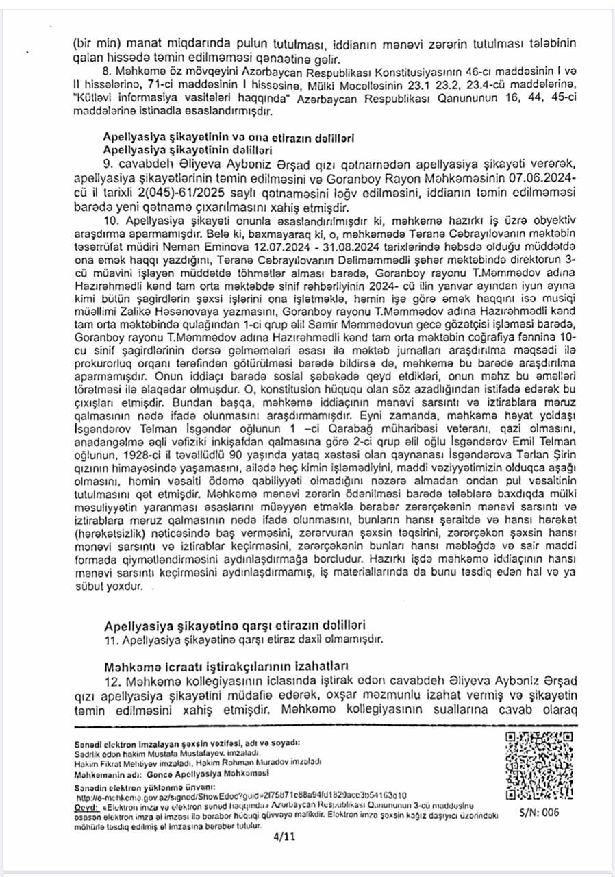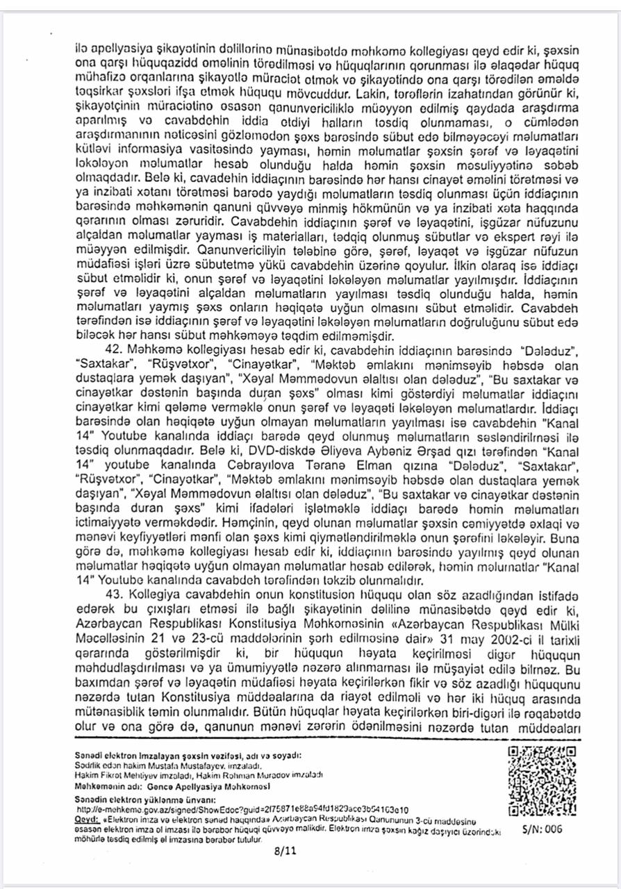 Vəziyyəti daha da gərginləşdirən isə bəzi xəbər saytlarının və Aybəniz Əliyevanı kor-koranə müdafiə edənlərin bu fürsətdən yararlanması oldu. Onlar tanımadıqları, işinə bələd olmadıqları Təranə Cəbrayılova haqqında həmin böhtan xarakterli materiallar əsasında məqalələr tirajlamağa başladılar. Bu mənəvi təzyiqlər qarşısında sarsılmayan Təranə xanım hüquqi dövlətin prinsiplərinə sığınaraq məhkəməyə müraciət etdi. Goranboy Rayon Məhkəməsi irəli sürülən ittihamların tamamilə əsassız olduğu qənaətinə gəldi. Gəncə Apellyasiya Məhkəməsi də bu qərarı qüvvədə saxlayaraq Təranə xanımın həm peşəkar nüfuzunu, həm də mənəvi paklığını bir daha təsdiq etdi. Bu məhkəmə çəkişməsində əsas məsələ tətbiq edilən cərimə deyil, mənəvi ucalığın qorunması və həqiqətin şəri məğlub etməsi idi.