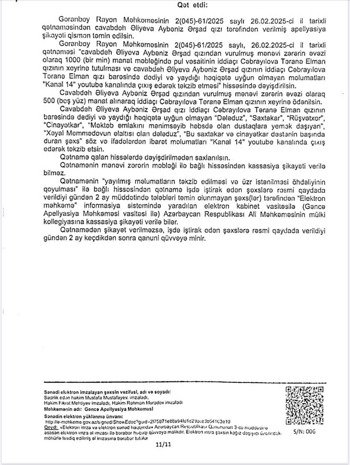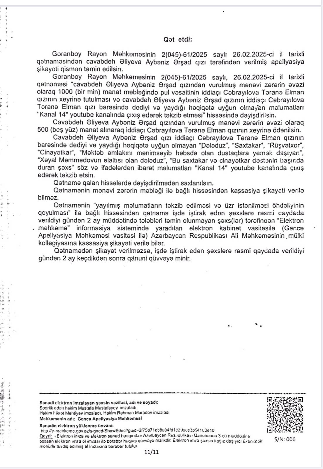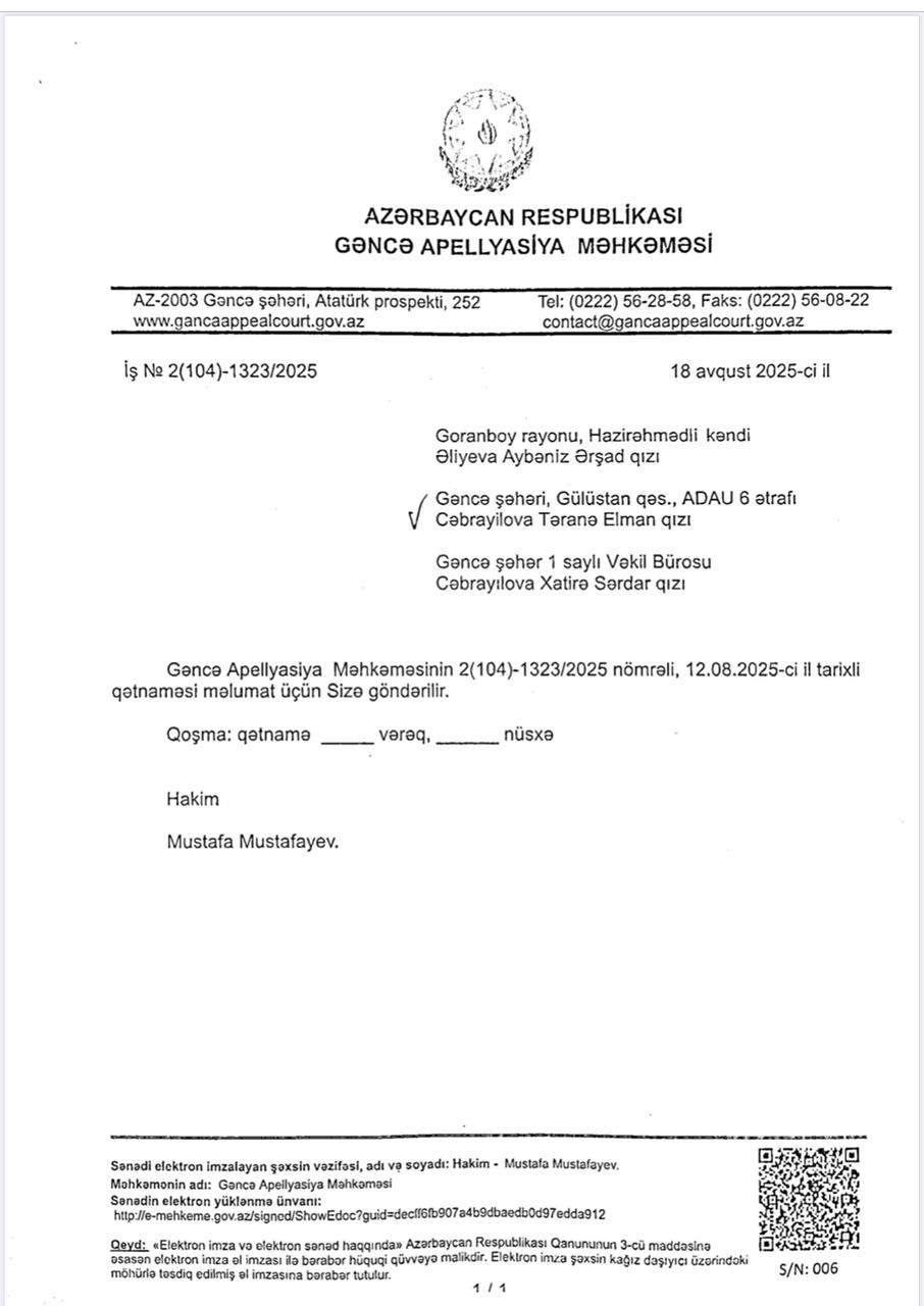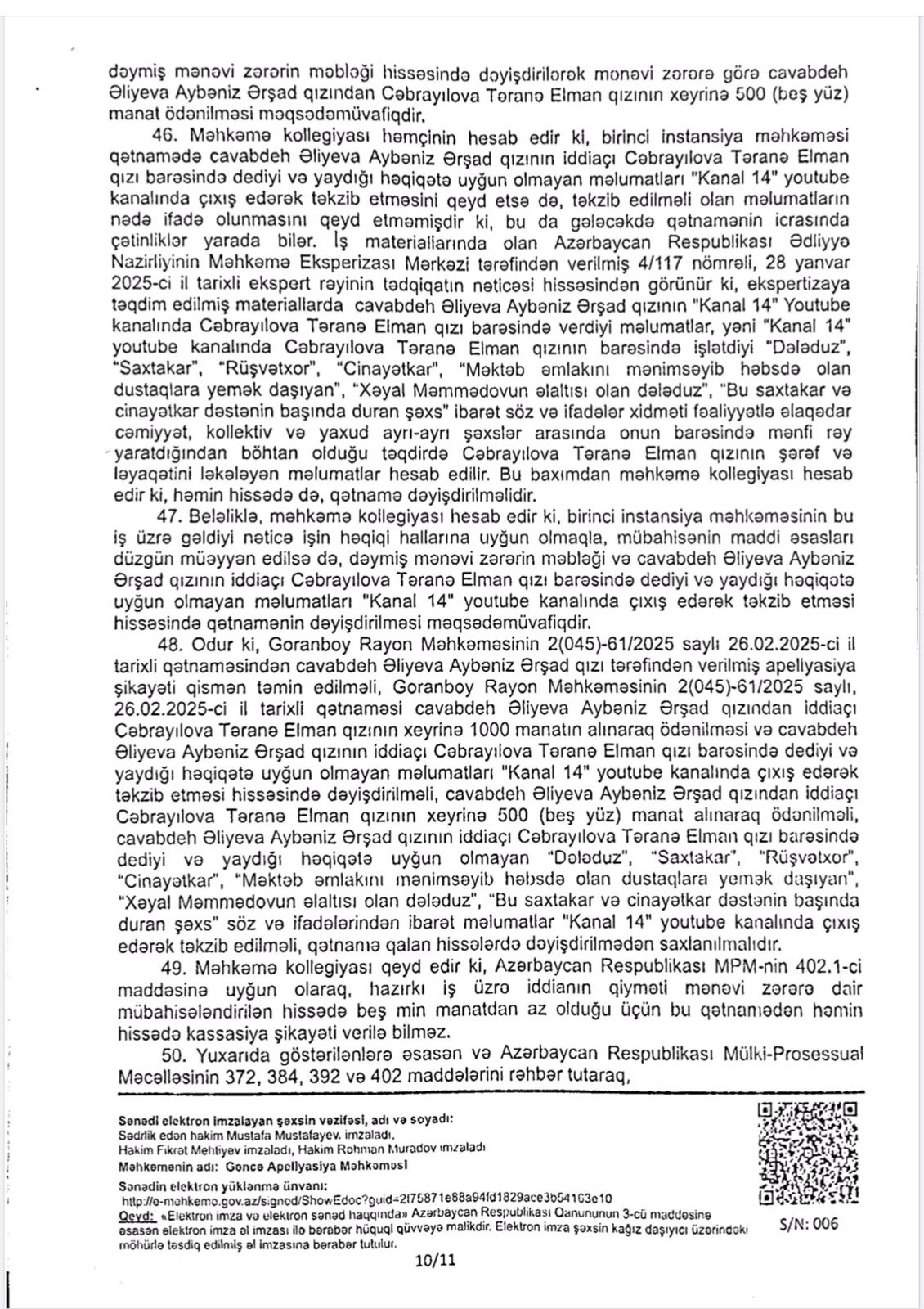 Vəziyyəti daha da gərginləşdirən isə bəzi xəbər saytlarının və Aybəniz Əliyevanı kor-koranə müdafiə edənlərin bu fürsətdən yararlanması oldu. Onlar tanımadıqları, işinə bələd olmadıqları Təranə Cəbrayılova haqqında həmin böhtan xarakterli materiallar əsasında məqalələr tirajlamağa başladılar. Bu mənəvi təzyiqlər qarşısında sarsılmayan Təranə xanım hüquqi dövlətin prinsiplərinə sığınaraq məhkəməyə müraciət etdi. Goranboy Rayon Məhkəməsi irəli sürülən ittihamların tamamilə əsassız olduğu qənaətinə gəldi. Gəncə Apellyasiya Məhkəməsi də bu qərarı qüvvədə saxlayaraq Təranə xanımın həm peşəkar nüfuzunu, həm də mənəvi paklığını bir daha təsdiq etdi. Bu məhkəmə çəkişməsində əsas məsələ tətbiq edilən cərimə deyil, mənəvi ucalığın qorunması və həqiqətin şəri məğlub etməsi idi.